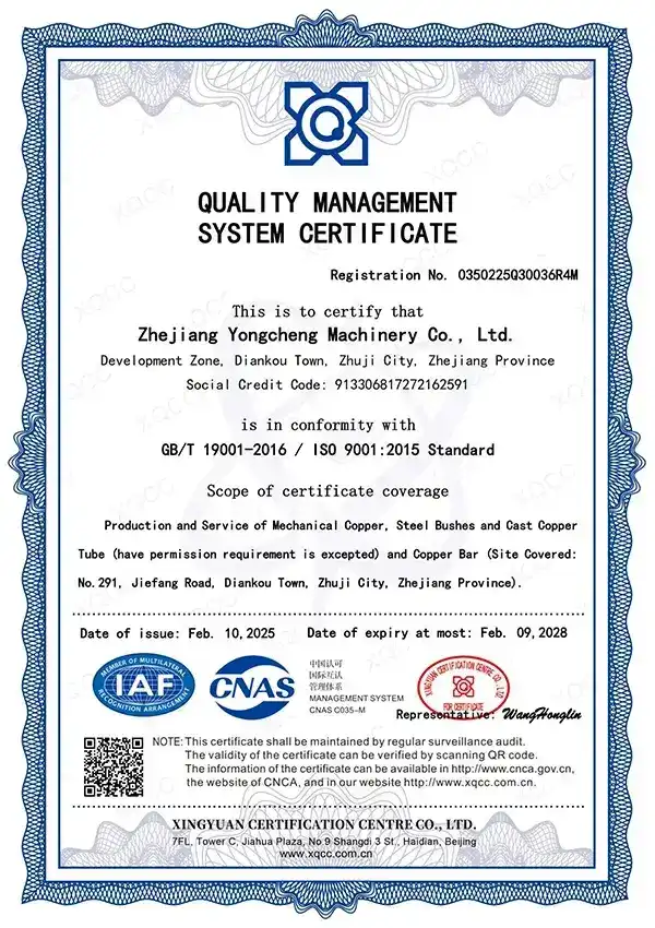 Главный принцип Yongcheng – завоевывать доверие клиентов честностью, отличным сервисом и надежным качеством. Мы получили сертификат ISO9001 в 2001 году и сертификат качества CCS в 2010 году, что является доказательством нашей приверженности высоким стандартам. От сырья до производства, финального контроля и непрерывного совершенствования продукции мы гарантируем, что каждая деталь отражает нашу преданность производству качественных продуктов.